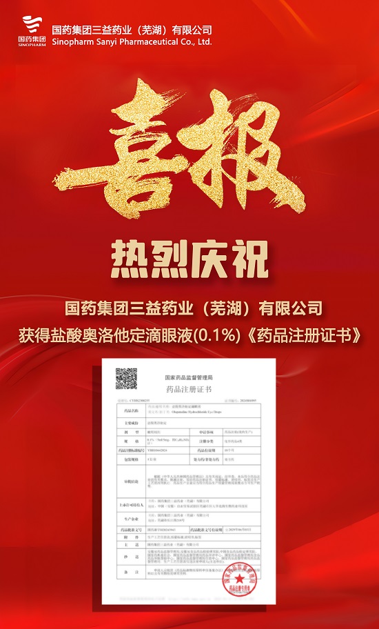 近日,国药集团三益药业(芜湖)有限公司收到国家药品监督管理局核准签发的盐酸奥洛他定滴眼液《药品注册证书》。