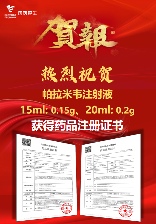 近日,国药集团容生制药有限公司收到国家药品监督管理局核准签发的帕拉米韦注射液(15ml:0.15g、20ml:0.2g)《药品注册证书》(化学药品3类)。